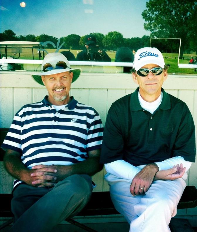 Here we are hanging, with our game faces on, outside the CK pro shop. Photo credits to artiste and smooth swinger Eddy Davis, (reflection in glass).